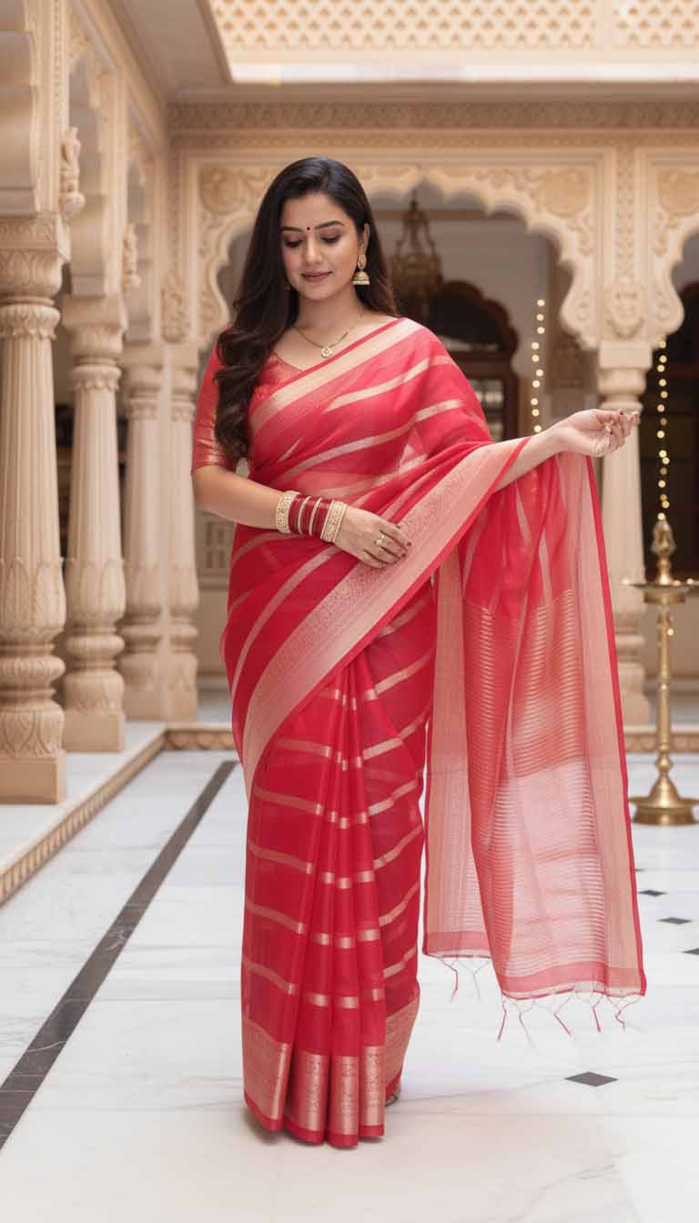 Weaving: Expertly woven with fine golden zari in elegant horizontal stripes, adding a subtle shimmer that complements the rich red base.