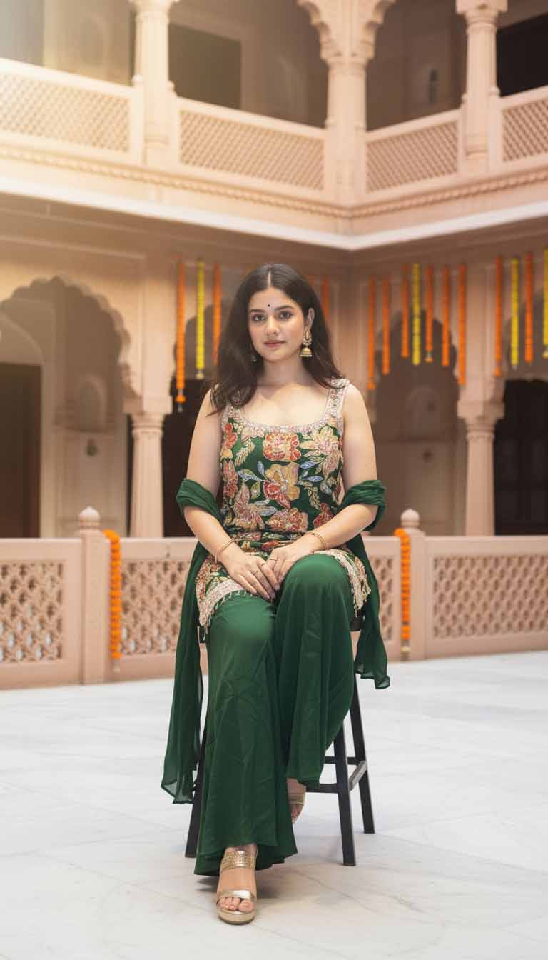 Perfect for festive gatherings, wedding functions, sangeet nights, or cultural celebrations. The Emerald Garden Sharara Set stands as an epitome of sophistication for women who appreciate fine artistry and modern Indian couture.