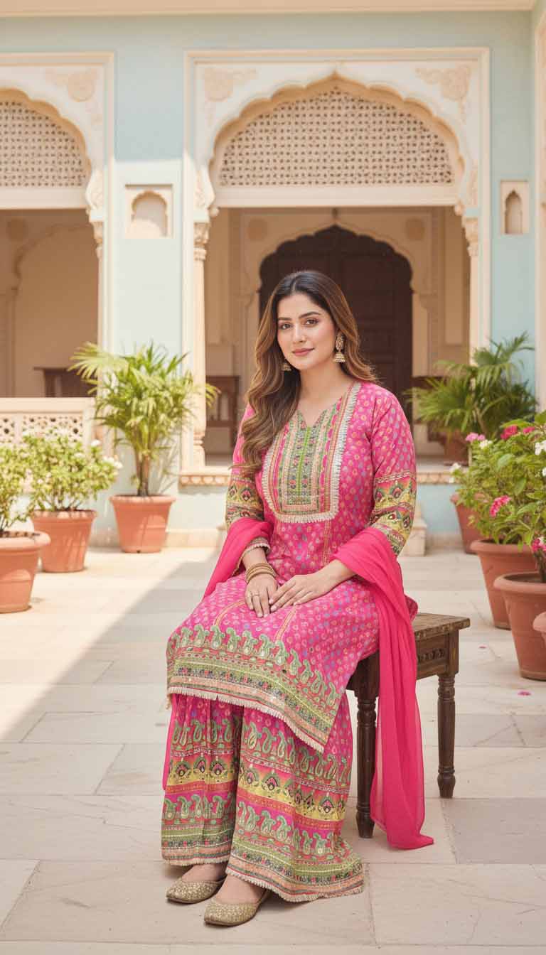 Color Palette: The ensemble’s rani pink base harmonizes with hues of olive, gold, and coral, reflecting joy, celebration, and regality.