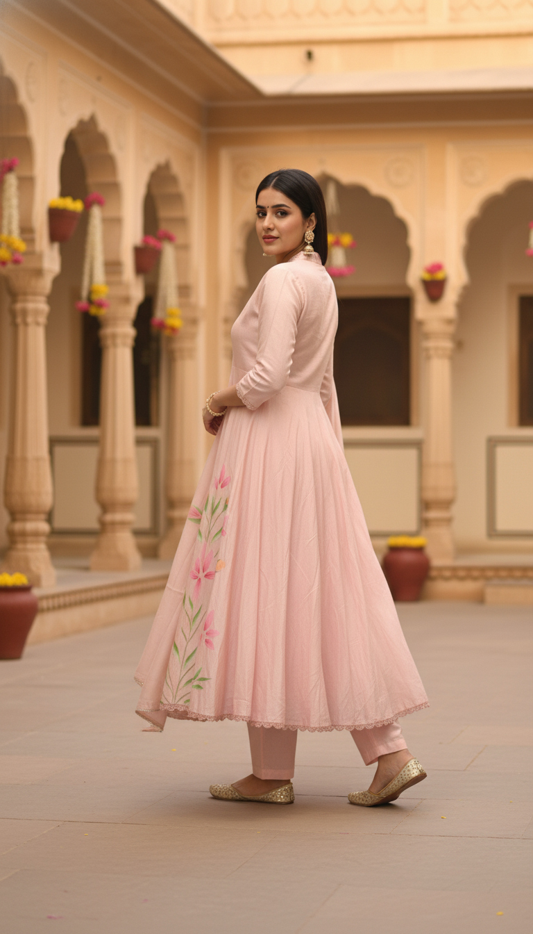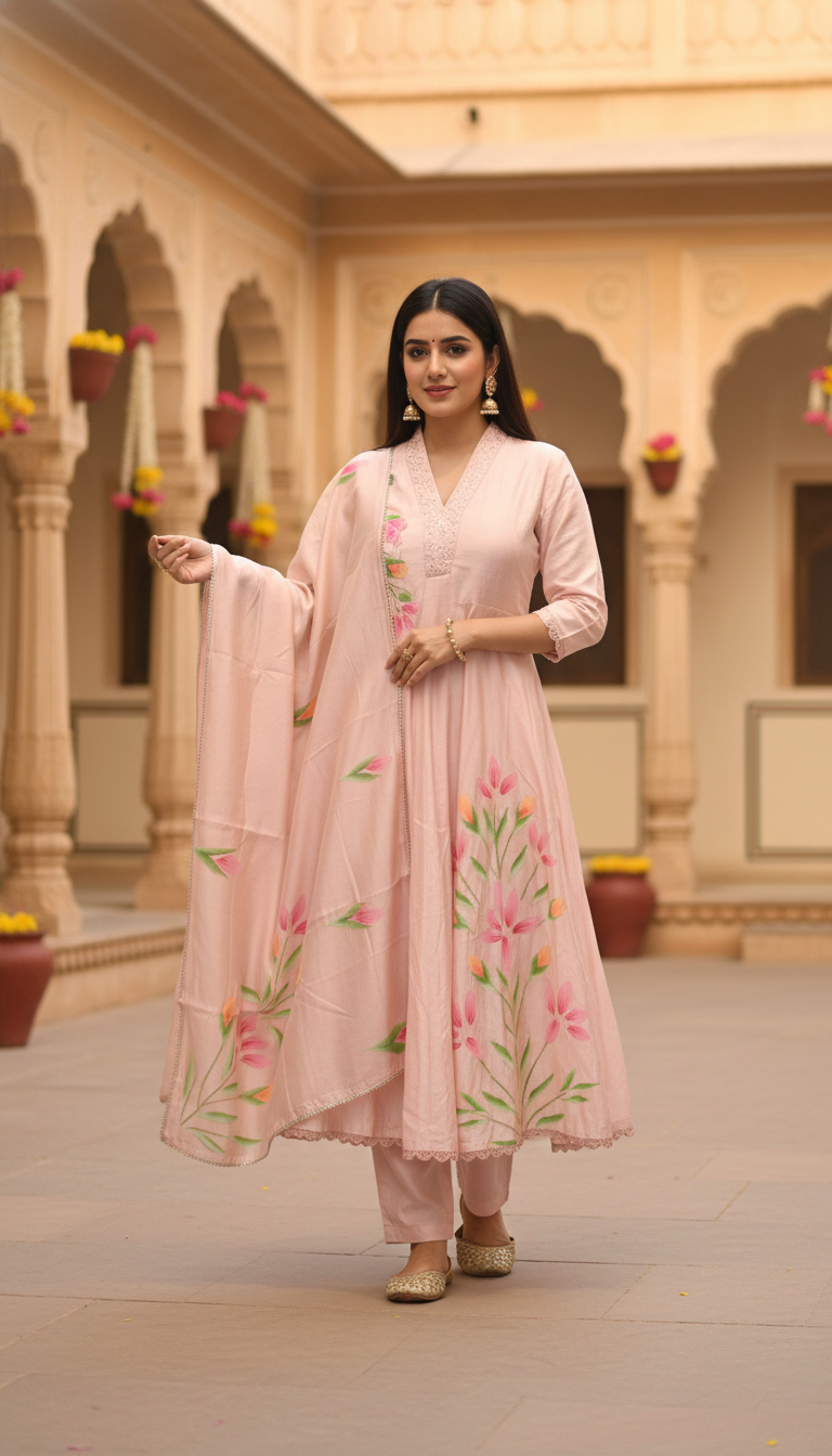 The Aaral Blush Pink Anarkali Suit from Sanrachna Co. is a poetic expression of elegance, femininity, and grace. Crafted in a serene pastel tone and adorned with delicate hand-painted florals, this ensemble seamlessly blends art with sophistication — a timeless piece for women who cherish subtle luxury.