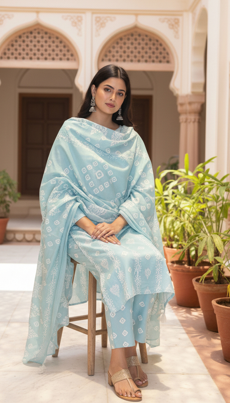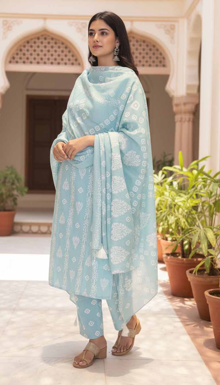 Breathe elegance and serenity with the Azure Whisper Handblock Cotton Suit Set from Sanrachna Co.. This ensemble captures the grace of handcrafted artistry and the tranquility of pastel hues — a perfect blend of comfort, culture, and contemporary femininity.
