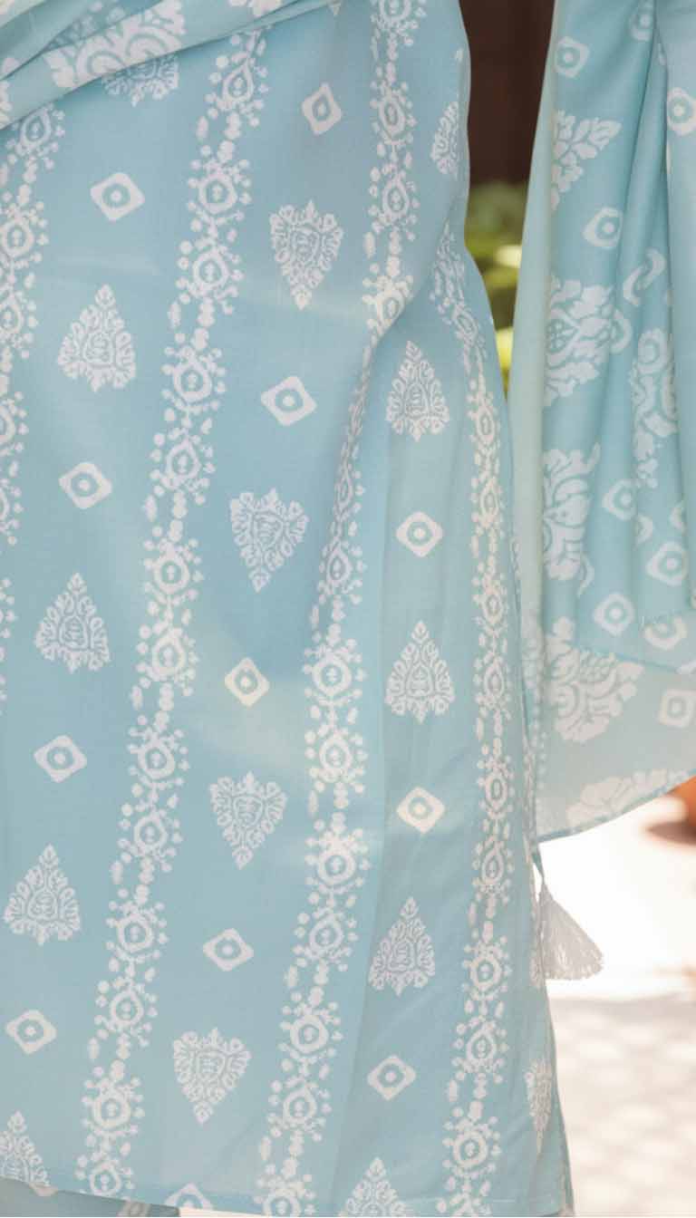 Kurta: Crafted from premium pure cotton, the sky-blue kurta showcases intricate handblock prints in ivory, reflecting traditional Rajasthani craftsmanship. The soft fabric ensures all-day comfort with an elegant fall and breathable texture.