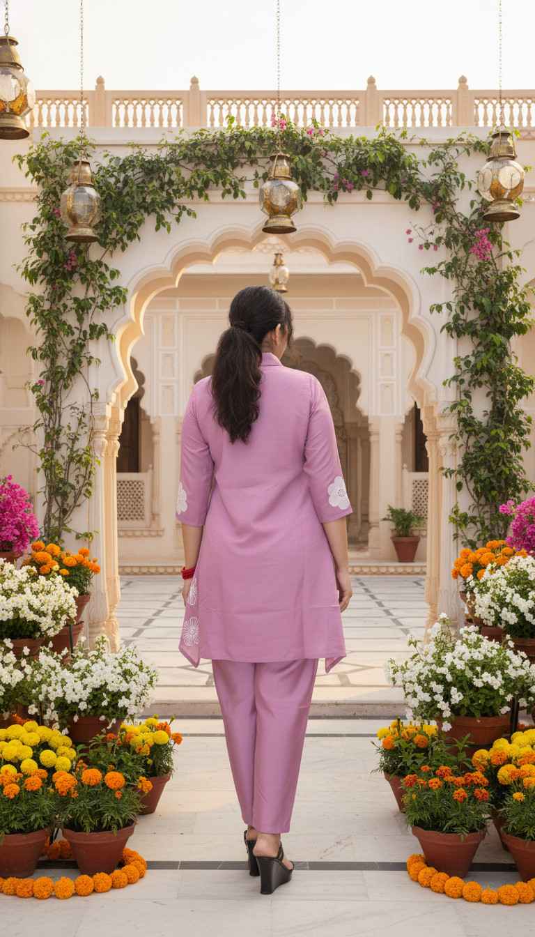 Perfect for daytime events, casual festive gatherings, family brunches, or elegant everyday wear. The Blush Petal Co-ord Set embodies effortless grace and modern Indian charm.