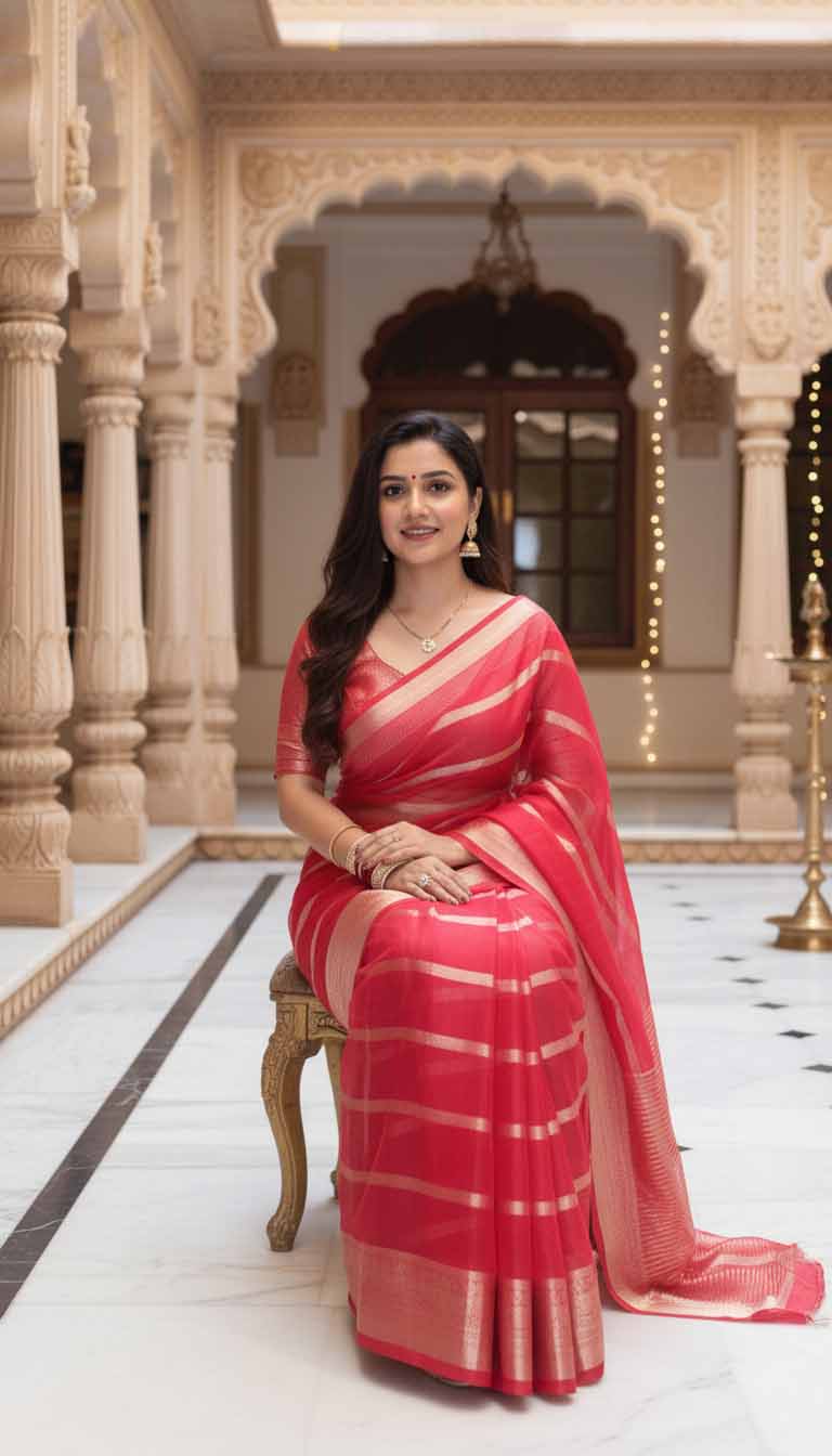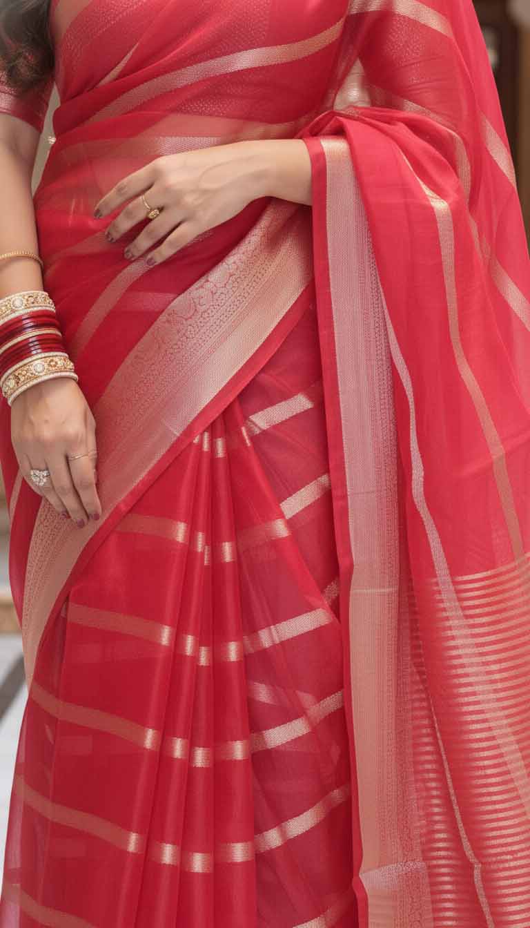 Weaving: Expertly woven with fine golden zari in elegant horizontal stripes, adding a subtle shimmer that complements the rich red base.