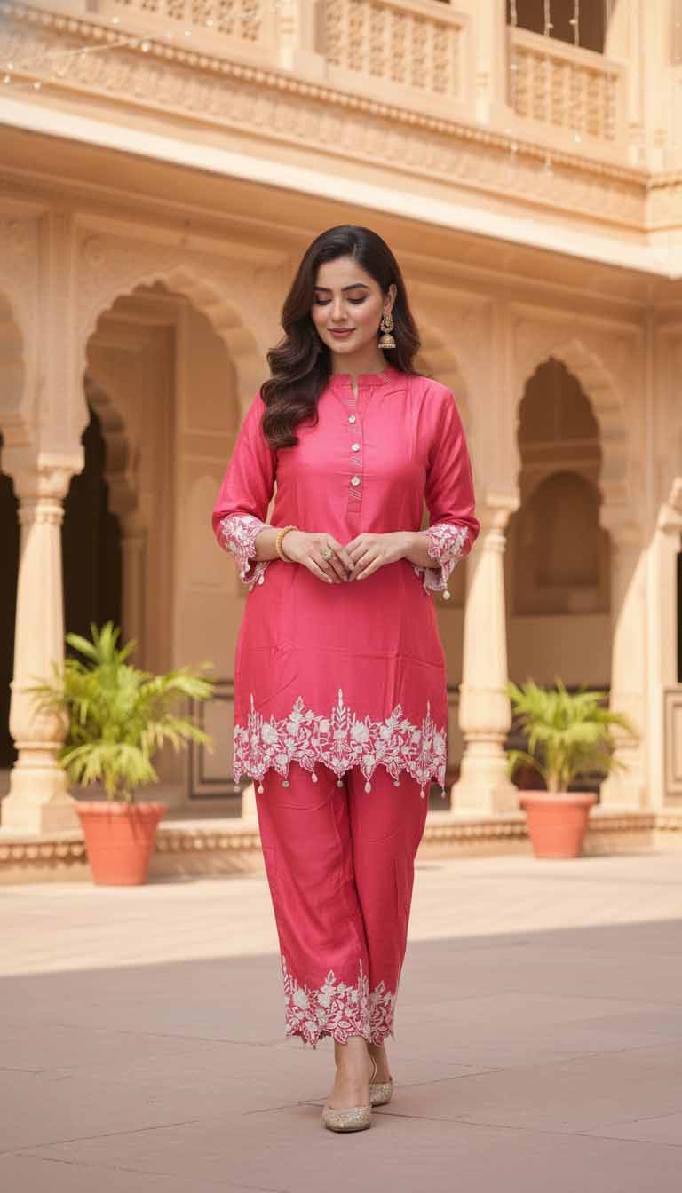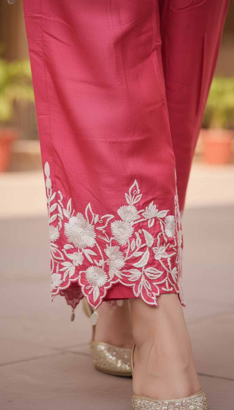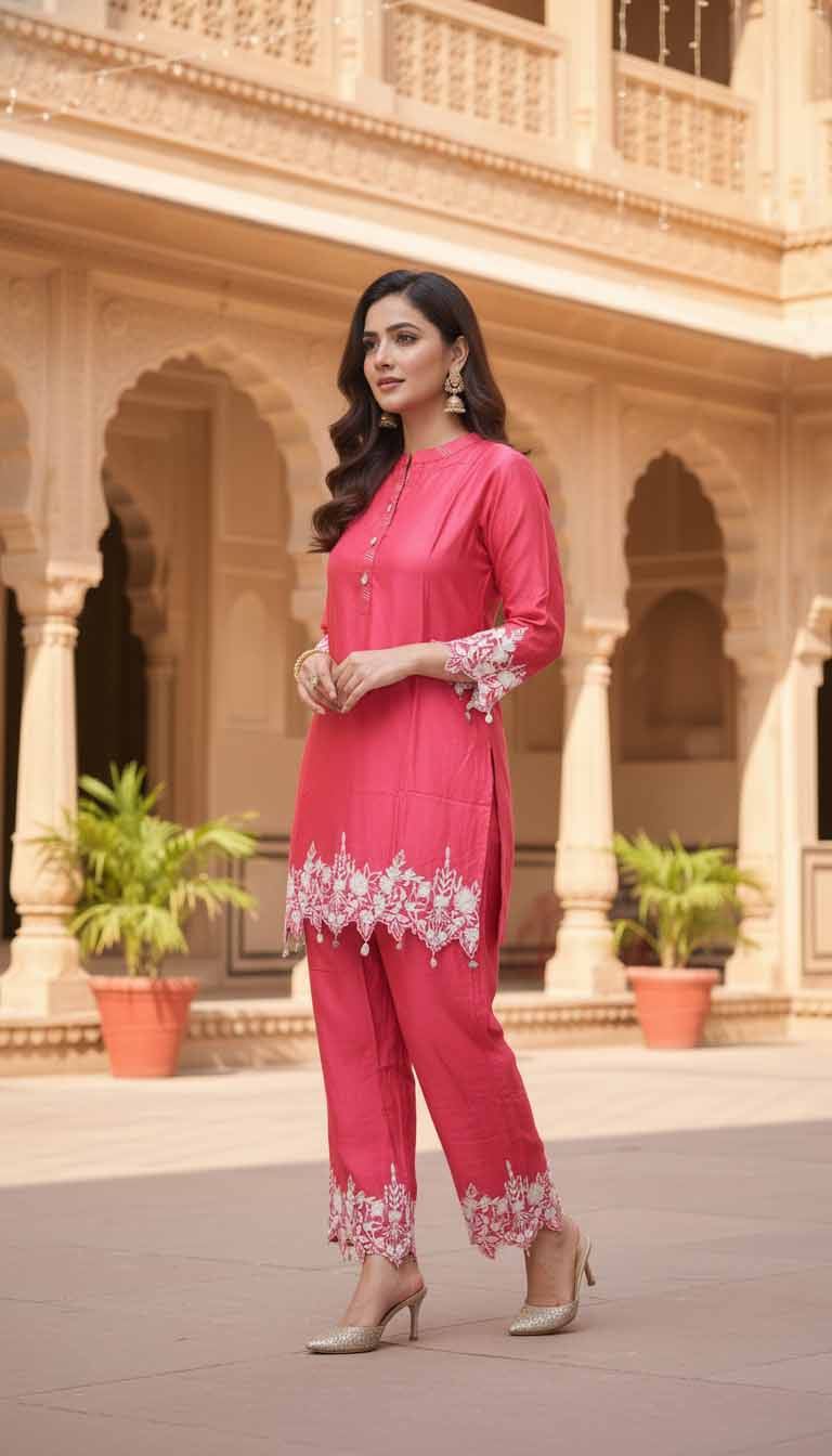 Color Palette: A rich rose-pink base contrasted with pristine white embroidery — a classic combination that exudes warmth, vibrance, and elegance.