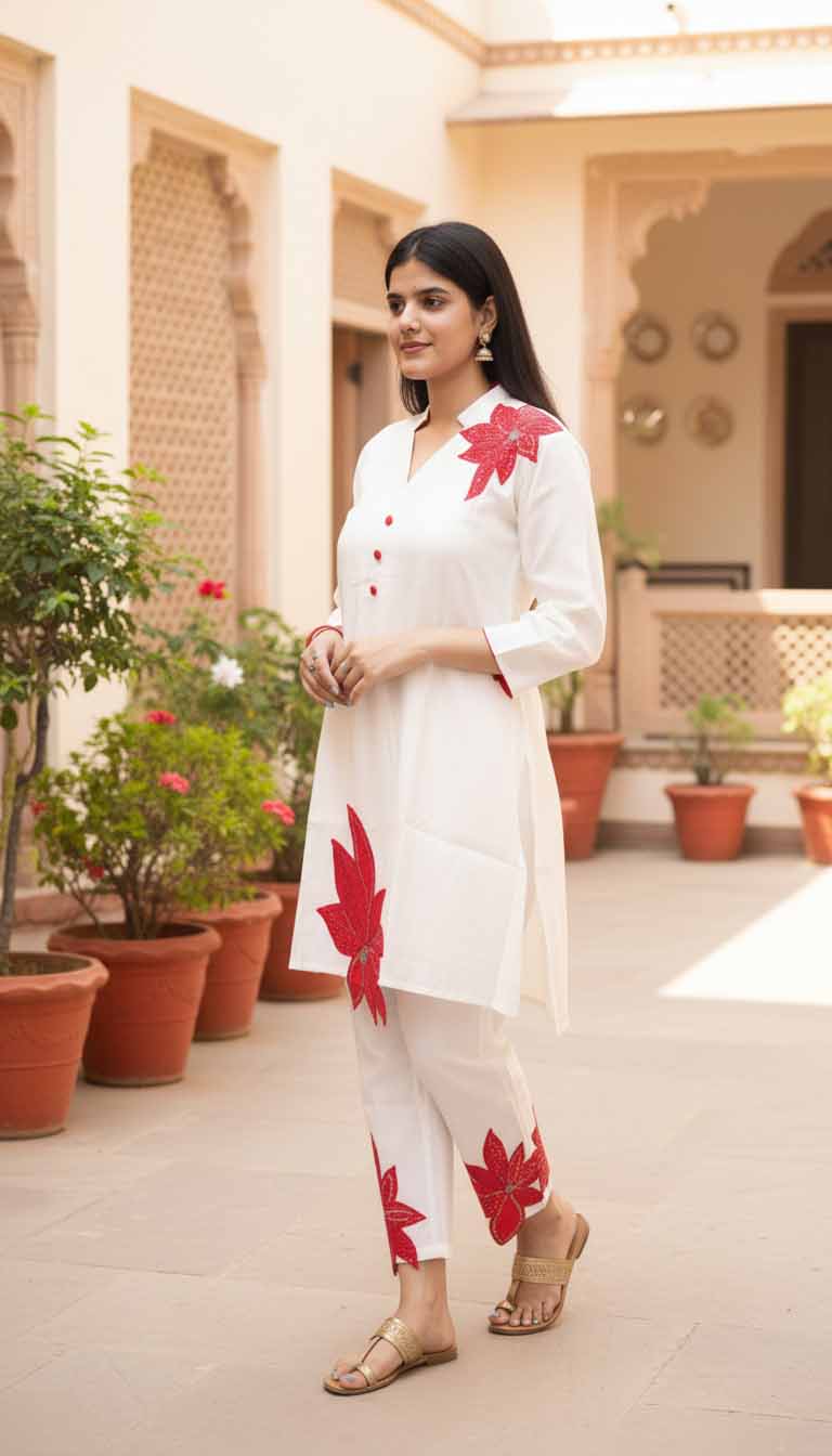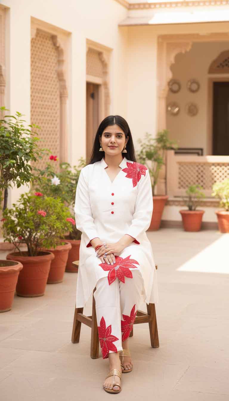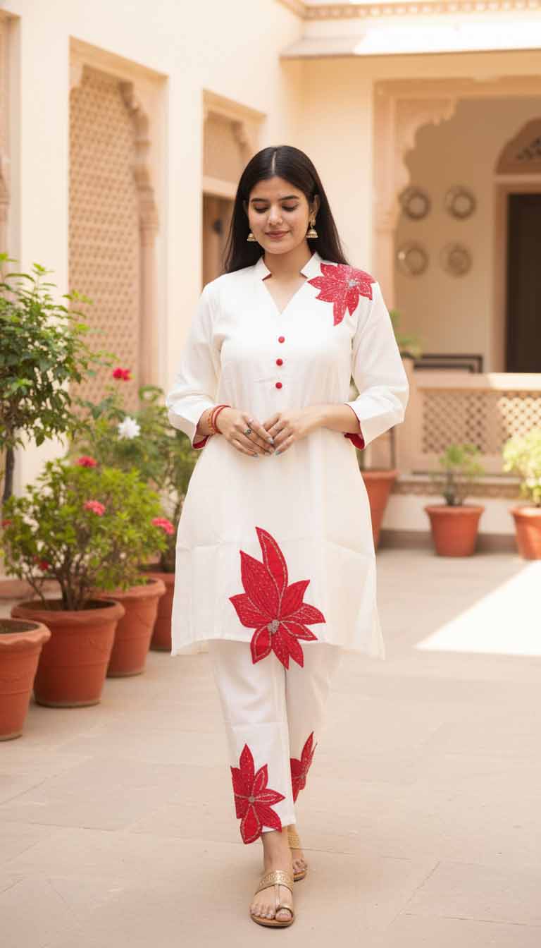 Radiate timeless elegance with the Ivory Blossom Hand-Embroidered Co-ord Set from Sanrachna Co., a perfect blend of simplicity and grace. Crafted in a pristine ivory base with bold red floral appliqué embroidery, this ensemble beautifully captures the essence of modern minimalism with a festive twist — ideal for daytime gatherings, celebrations, and cultural occasions.