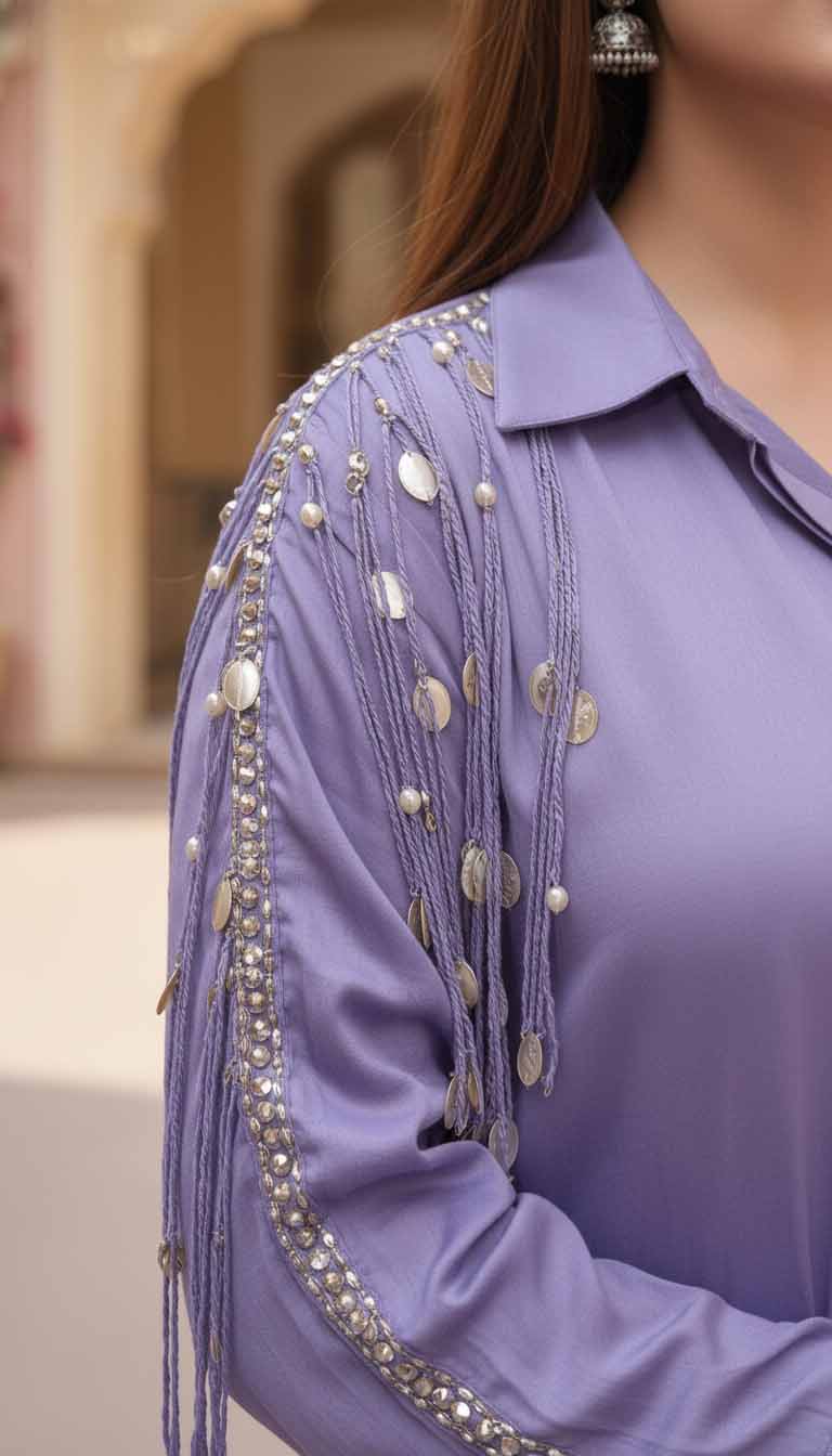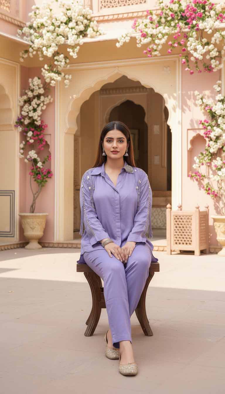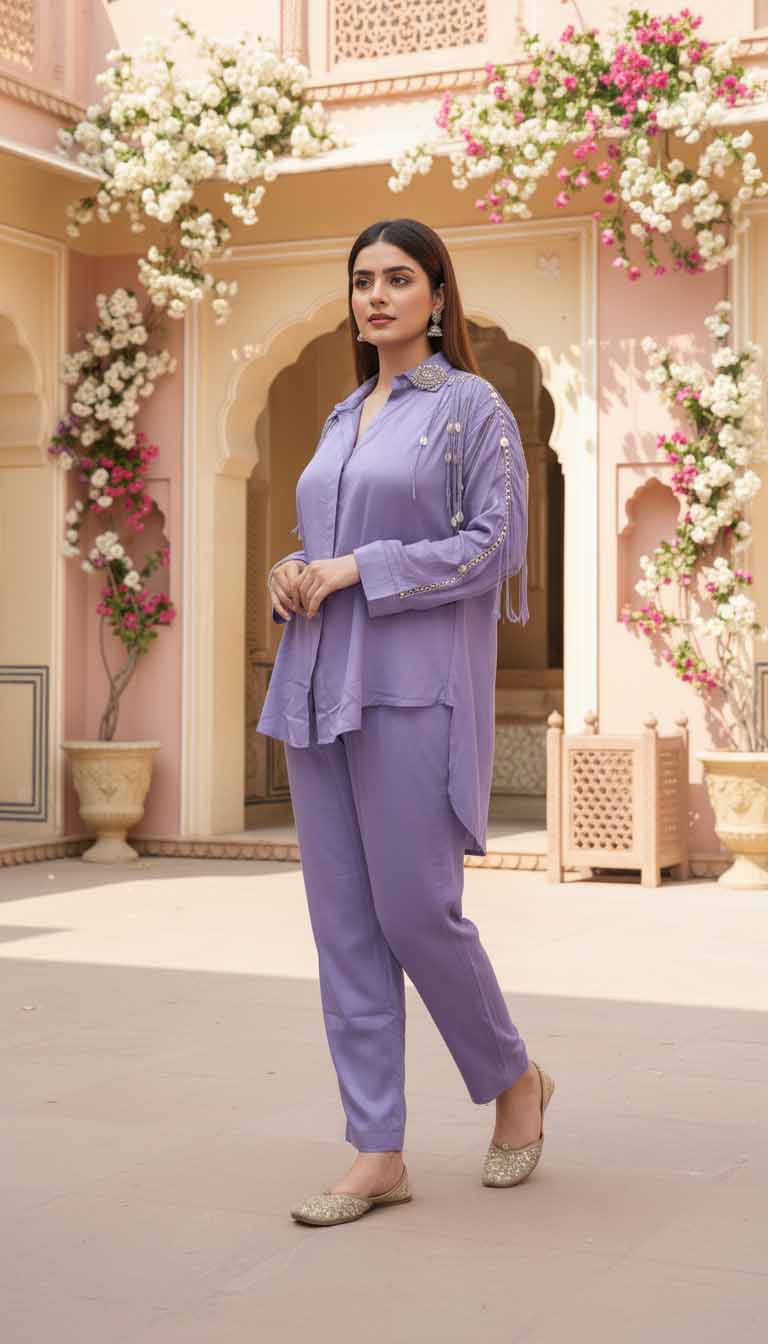 The lilac hue symbolizes serenity, grace, and creativity — making this co-ord set a reflection of confidence and individuality. It’s the embodiment of modern femininity wrapped in timeless allure.