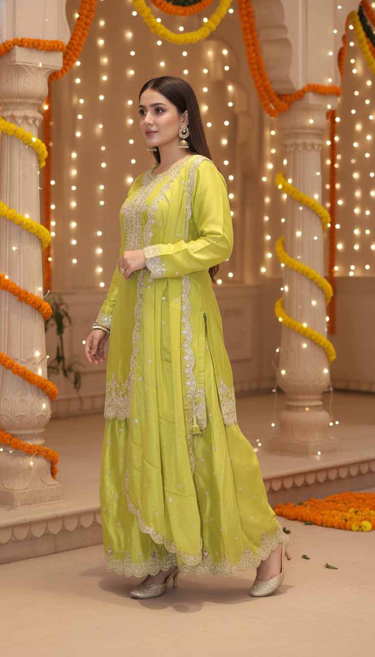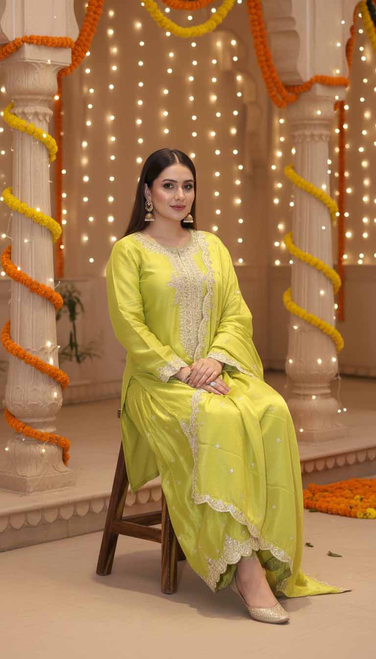 An impeccable choice for weddings, festive celebrations, and evening gatherings. The Lime Radiance Silk Suit stands out for its regal sheen and delicate craftsmanship — ideal for women who appreciate fine artistry with a touch of contemporary elegance.