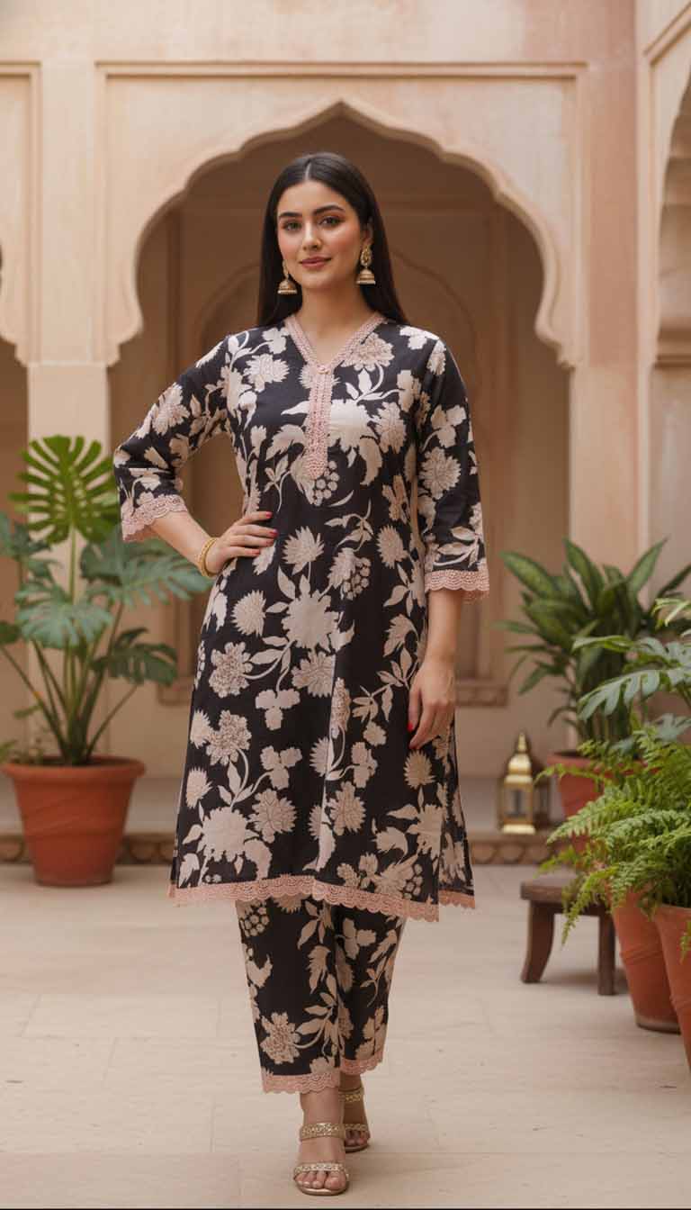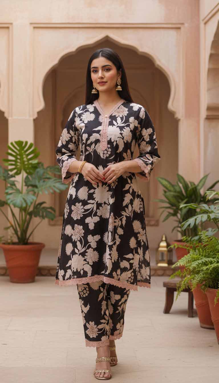 Top: Crafted from premium cotton satin, the long kurta features a classic straight silhouette adorned with blush-toned floral prints. The neckline and hemline are delicately enhanced with intricate lacework, lending a soft feminine touch.
