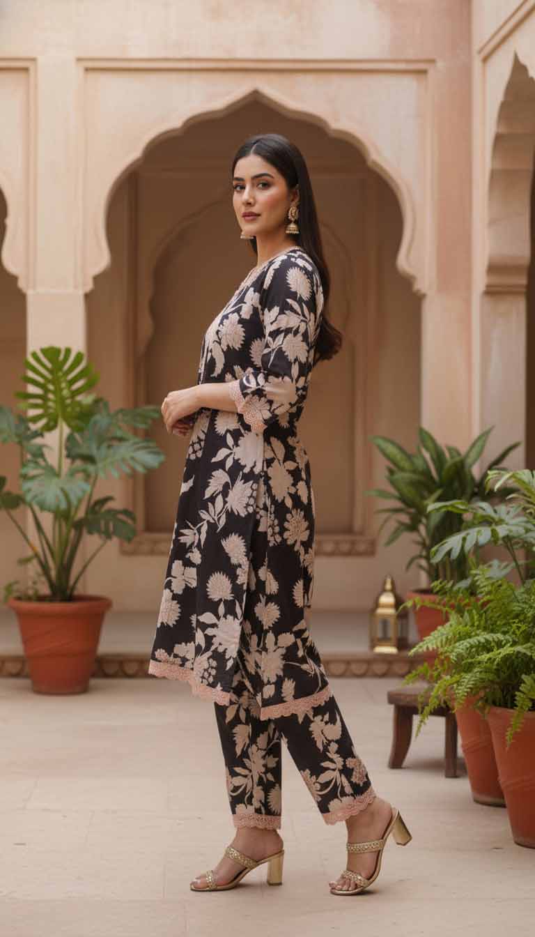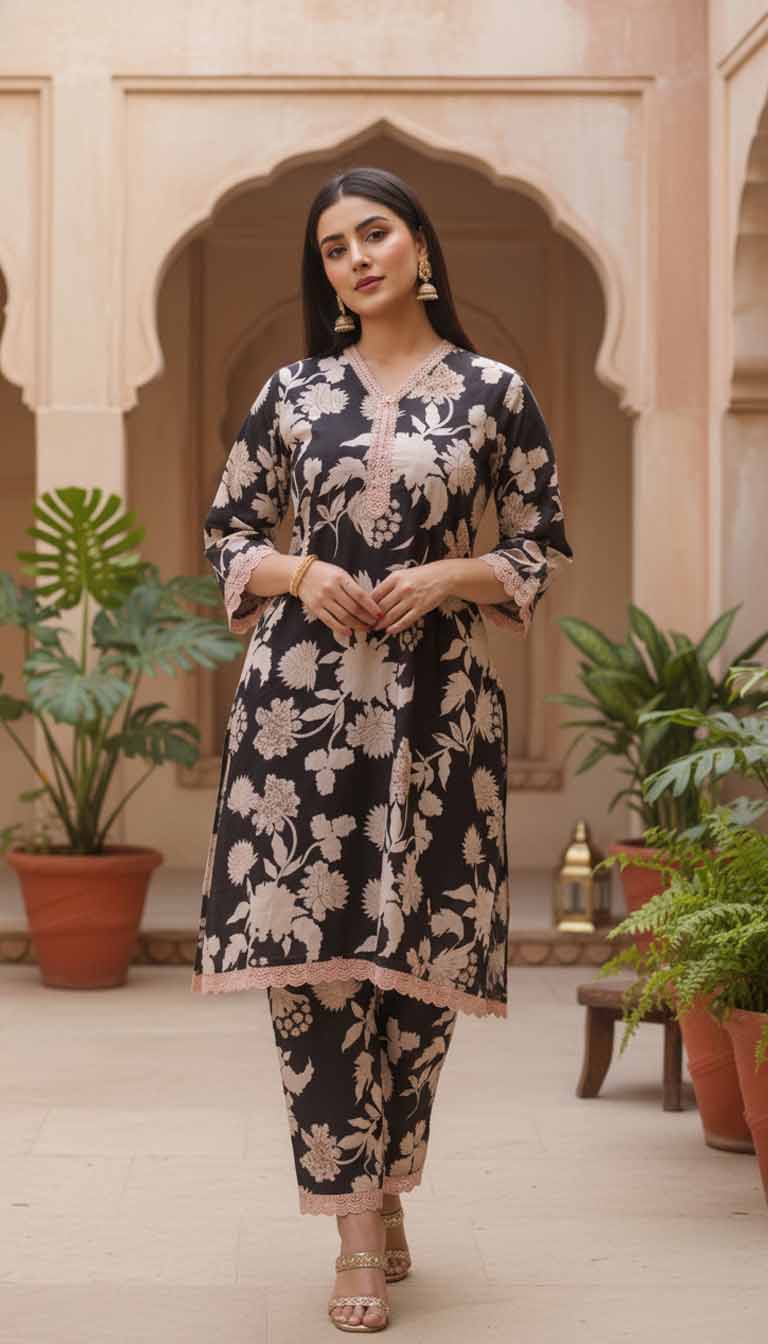 Exude understated luxury with the Noir Petal Printed Co-ord Set from Sanrachna Co., a stunning ensemble that marries comfort with timeless grace. Featuring a serene floral print over a deep black base, this set embodies refined elegance — perfect for both casual and festive settings. Designed for the modern woman who values sophistication in simplicity, this outfit reflects effortless beauty and composure.