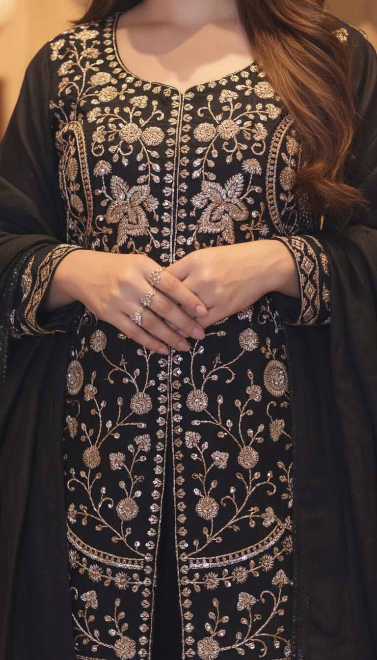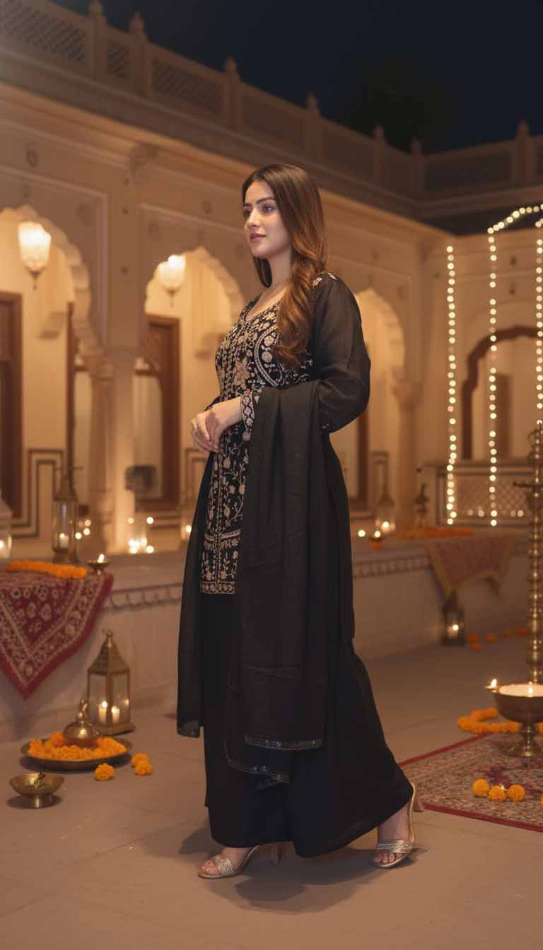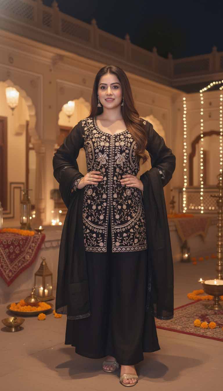 An ode to timeless elegance and regal craftsmanship, the Nooré Black Luxe Sharara Set from Sanrachna Co. radiates classic sophistication. Designed for the woman who embodies grace and confidence, this ensemble brings together intricate threadwork and rich textures — perfect for festive evenings and grand celebrations.