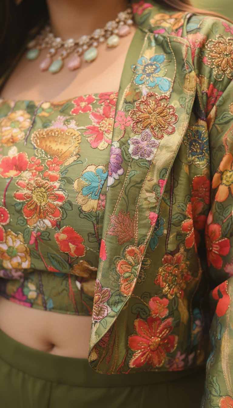 The Olive Aura Set symbolizes understated luxury and strength — representing the contemporary Sanrachna woman who redefines festive dressing with individuality and grace. The floral brocade celebrates heritage weaves, while the modern silhouette bridges the gap between couture and comfort.