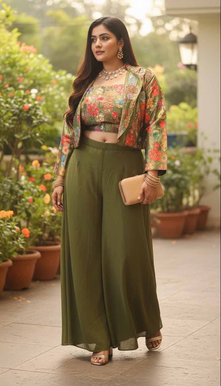 Silhouette: The set features a modern cropped blouse and jacket paired with high-waisted, wide-fit palazzos — a flattering silhouette that elongates the frame.