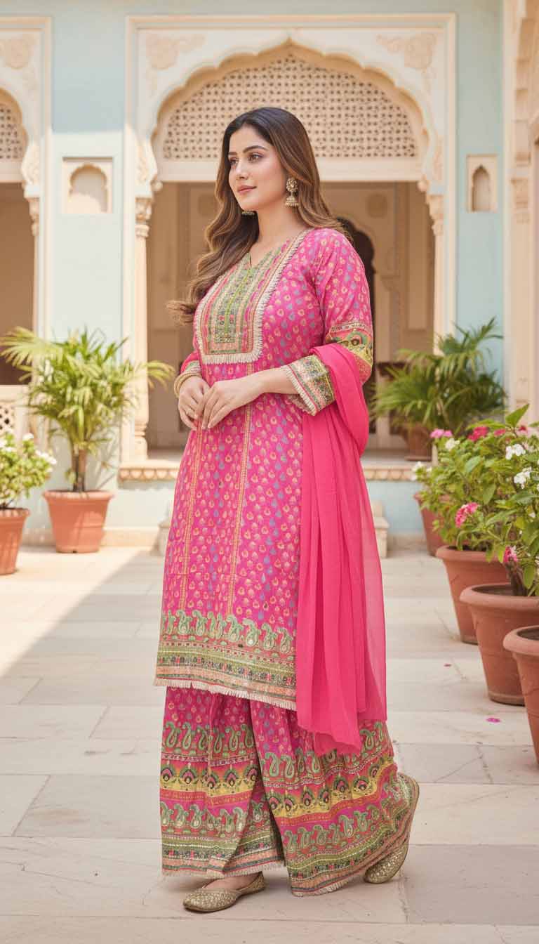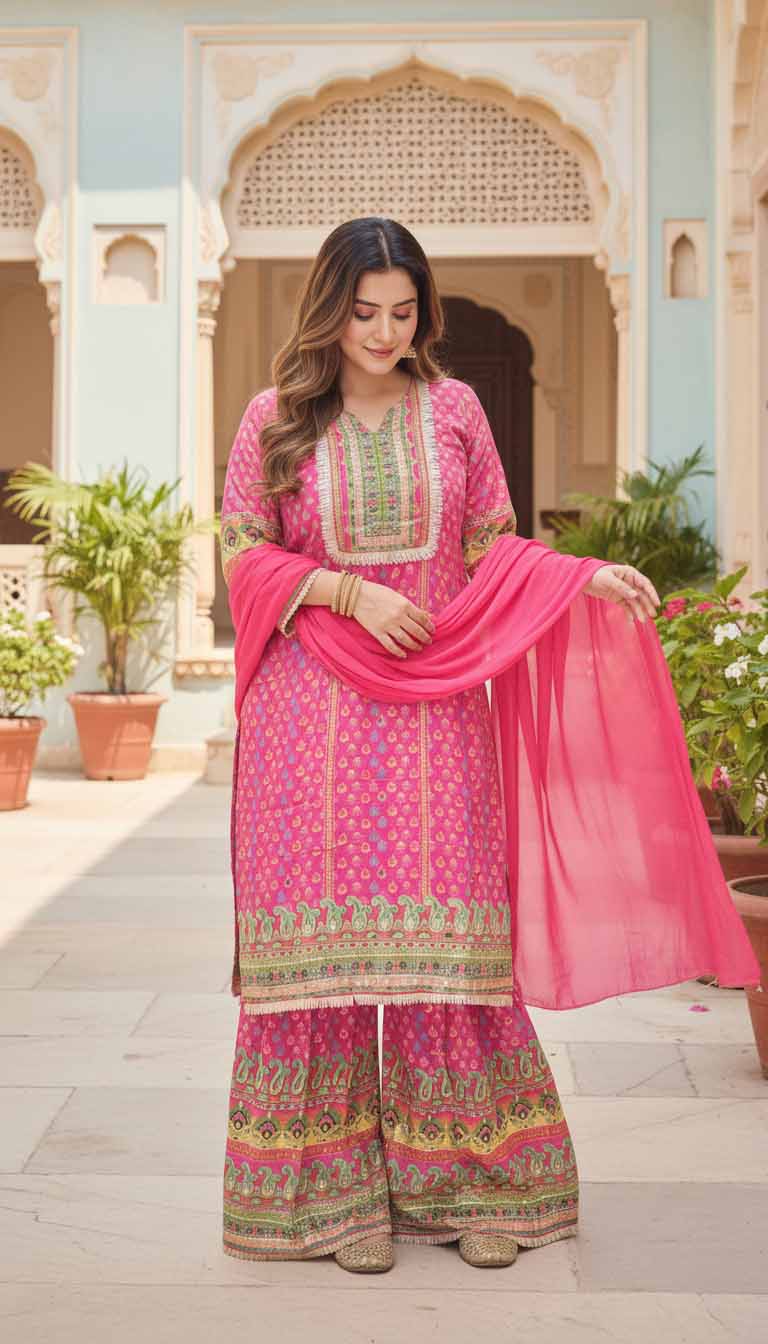 Kurta: Made from premium blended silk fabric, the kurta showcases a brilliant rani pink base adorned with traditional zari, resham, and sequin embroidery in gold, green, and peach tones. The smooth texture and gentle sheen of the fabric add a festive brilliance, making it ideal for celebrations.